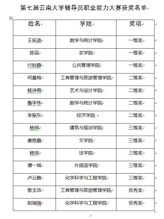 11月16日、17日,第七届云南大学辅导员职业能力大赛成功举办,37名专兼职辅导员参加了比赛。经过两天四个环节的激烈角逐,最终王拓迪等3名选手获得一等奖,何曼榕等4名选手获得二等奖,杨俏等5名选手获得三等奖,黎玉洁等2名选手获得优秀奖。王拓迪将代表云南大学参加云南省第七届高校辅导员职业能力大赛决赛。