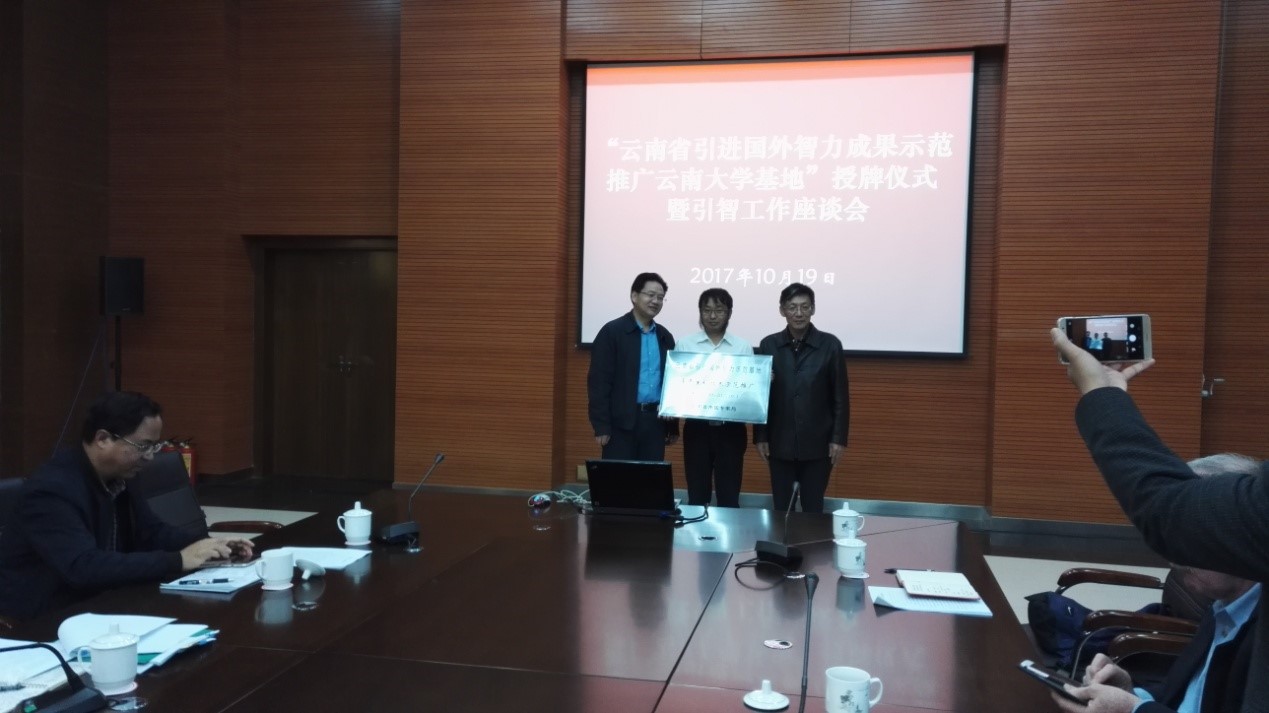2017年10月19日,云南省外专局阮朝奇局长及张明处长莅临云南大学,为云南省引进国外智力成果示范推广云南大学基地--多年生稻技术示范推广引智基地进行授牌。