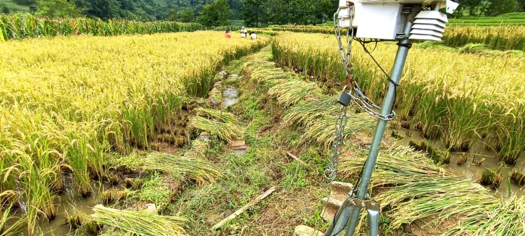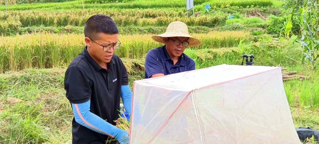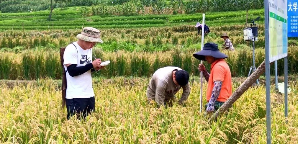 梯田里,研究团队人员正用卷尺和测量仪器进行测产,他们介绍说:“第二年第三季的多年生稻‘云大25’产量达到了500公斤”。