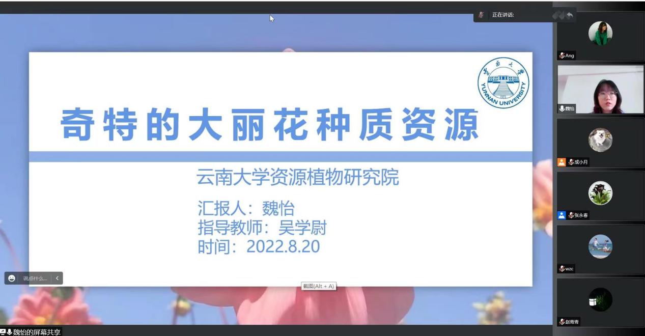 交流会上,云南大学资源植物研究院·农学院研究生魏怡以“奇特的大丽花种质资源”为题,采用线上报告的形式,详述了整理大丽花属原种信息与完善大丽花花型分类标准,并通过资料搜集与实地调研云南、贵州、广西、四川等地的种质资源,在4省市的山地、村落找到了许多花型奇特、抗性优良或块根繁殖能力强的宝贵的野生资源,为大丽花的种质资源的整合和大丽花育种的研究打下基础。研究生王蕊嘉以“不同温度处理对珠芽魔休眠调控的影响”为题,详述了不同温度处理下珠芽魔芋球茎的生物表型、理化性质和分子机理之间的变化规律,研究结果为生产中缩短魔芋种球休眠期,调控种球休眠,实现魔芋种球周年种植周年采挖提供理论和实践基础。