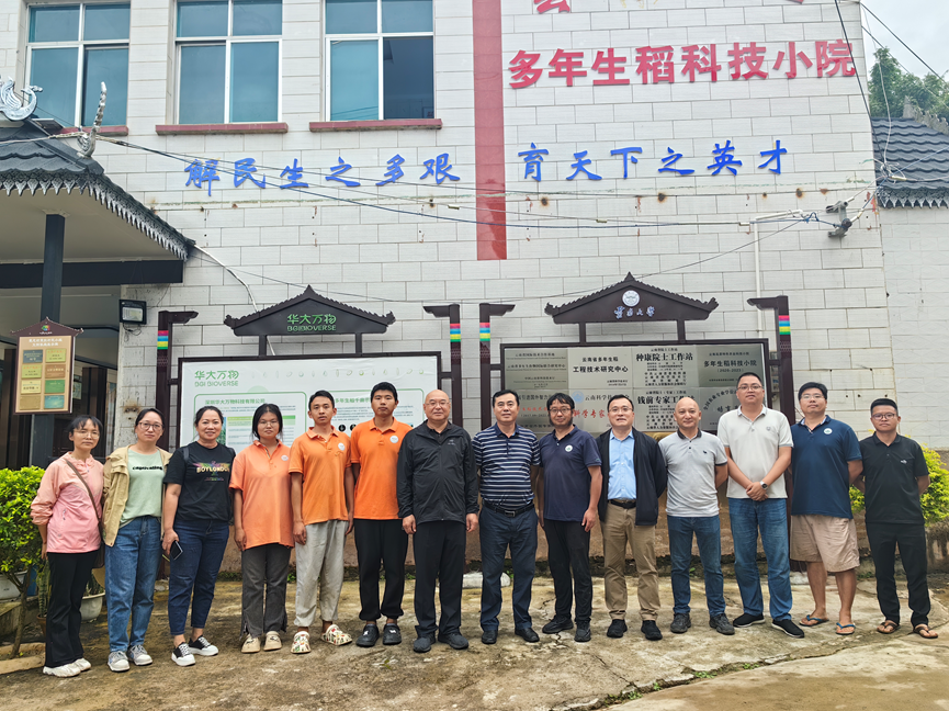 正值晚稻抽穗期,潘文博一行在景洪田间试验站详细了解了多年生稻研究历史和培育过程,实地察看了多年生稻田间长势及遗传改良试验,对云南大学多年生稻科技小院师生多年生稻种质创新与育种工作给予了肯定。
