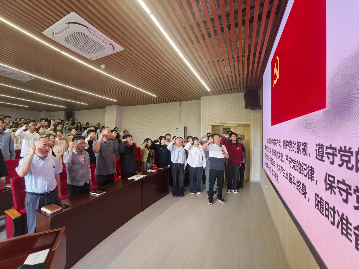 10名预备党员在鲜红的党旗下宣誓,全体党员重温入党誓词