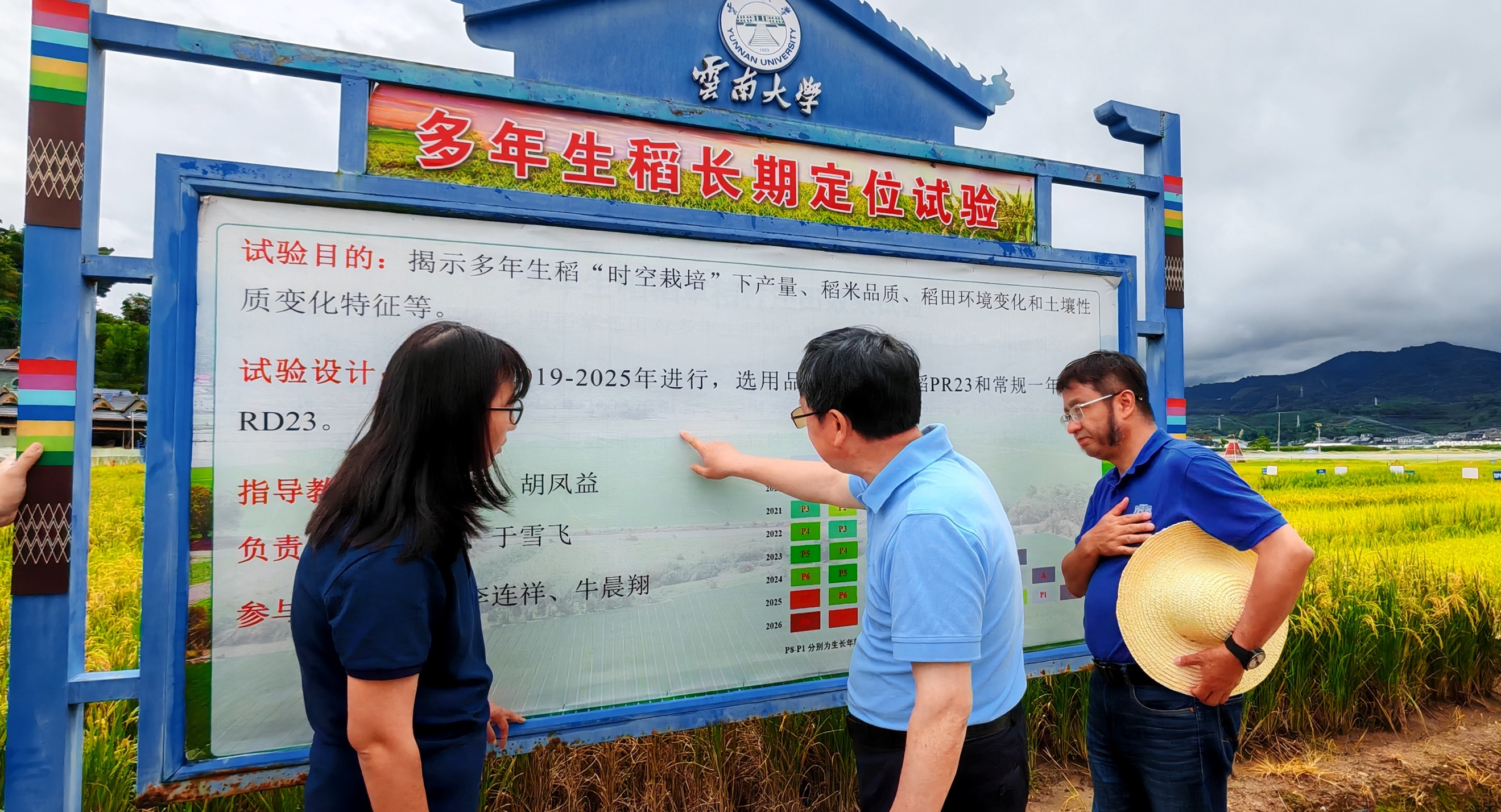 2025年7月5-6日,云南大学副校长唐年胜教授一行赴西双版纳勐海县,深入农学院多年生稻科技小院实地了解研究生培养工作,重点指导农学学科建设与农学学科人才培养工作。实地考察了多年生稻遗传改良的基础研究、品种选育、栽培技术、推广成效及田间管理等情况。并与驻点师生进行深入交流,详细询问他们的生活、学习、科研进展情况,勉励青年学子要"把论文写在祖国大地上",将理论知识与实践探索紧密结合,厚植"三农"情怀。