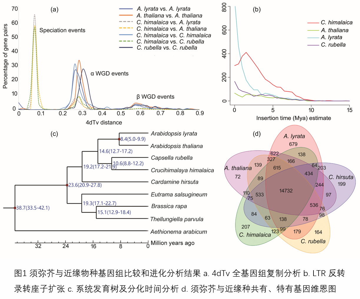 该研究对青藏高原特有分布的拟南芥近缘种须弥芥(Crucihimalaya himalaica)进行了基因组适应性进化研究。研究结合二代和三代高通量测序技术,组装得到了234.72Mb的须弥芥基因组,包括 27019个预测基因。系统发育分析显示须弥芥与荠菜最近缘,分化时间大约为8.8-12.2个百万年,而与拟南芥属分化时间约为12.7-17.2个百万年。青藏高原在上新世晚期至更新世快速隆升之后,须弥芥的LTR反转录转座子发生了明显的扩张,说明转座子的爆发可能与环境适应有关。须弥芥基因组中抗病相关的基因发生了缩减,而与泛素介导的蛋白水解和DNA损伤修复相关基因发生了明显的扩张和受到强烈的自然选择,这与青藏高原低温、强紫外线等极端环境因素有关。此外,须弥芥中自交亲和相关基因变为假基因或丢失,这是导致须弥芥自交亲和的根本原因,也是该物种适应青藏高原传粉昆虫少的一种策略。综上,该研究为青藏高原植物适应极端环境的分子机制提供了新的线索,同时该研究发现植物与动物对青藏高原的适应机制既有相似点(DNA修复途径、抗病途径),也有不同点(植物自交亲和性、植物激素途径)。