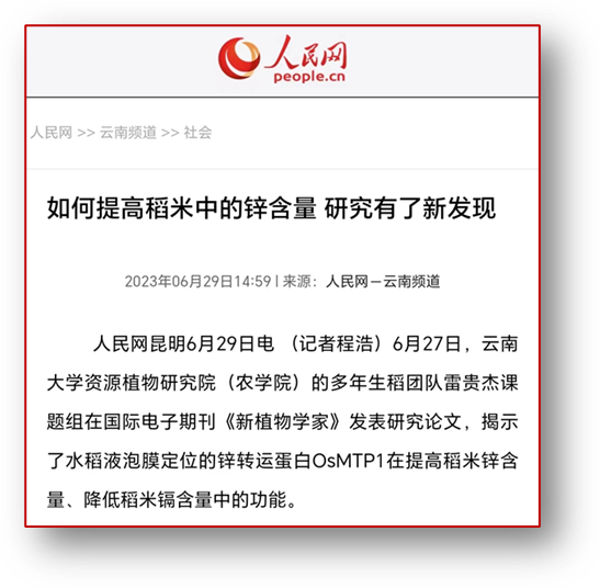 该研究得到了人民网云南频道的报道:如何提高稻米中的锌含量 研究有了新发现。