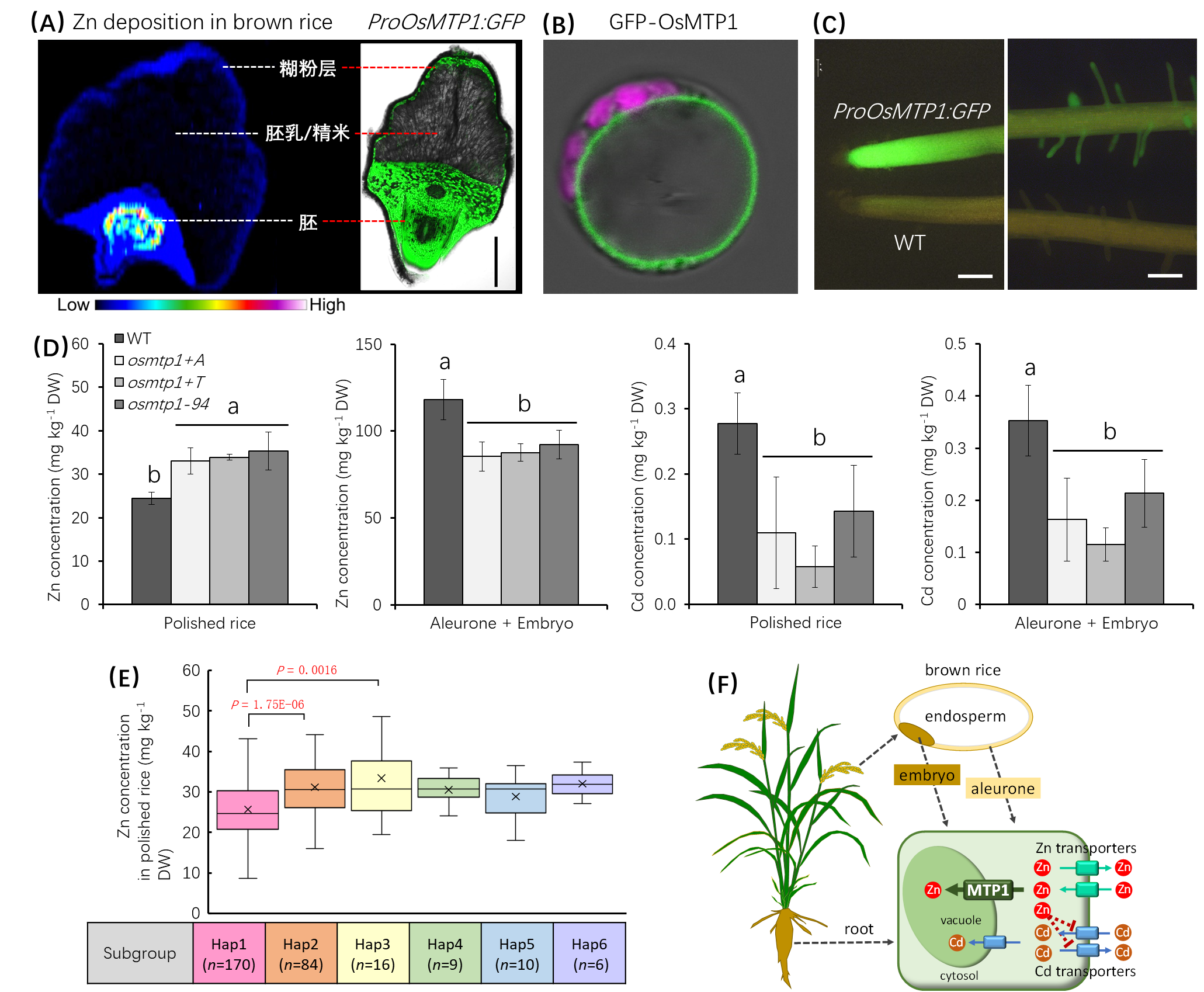雷贵杰组通过LA-ICP-MS明确了糙米中的Zn主要沉积于胚和糊粉层(米糠),然后通过RNA-seq筛选获得在胚和糊粉层中高表达的候选转运蛋白基因OsMTP1(图1A)。明确了OsMTP1定位于液泡膜(图1B),OsMTP1在根、糊粉层和胚中高表达(图1A,C)。发现了OsMTP1基因突变不影响稻米产量,但osmtp1突变体的根系、胚和糊粉层中的Zn浓度显著降低,同时地上部、糙米(+41%)和精米(+30%)中的Zn浓度大幅升高(图1D)。酵母实验表明OsMTP1运输Zn离子,很可能不运输Cd离子。但osmtp1突变体的秸秆、糙米(-75%)和精米(-63%)的Cd浓度大幅降低(图1D)。另外,单倍型分析还发现了2个优异OsMTP1等位基因与精米高Zn积累显著相关(图1E)。
