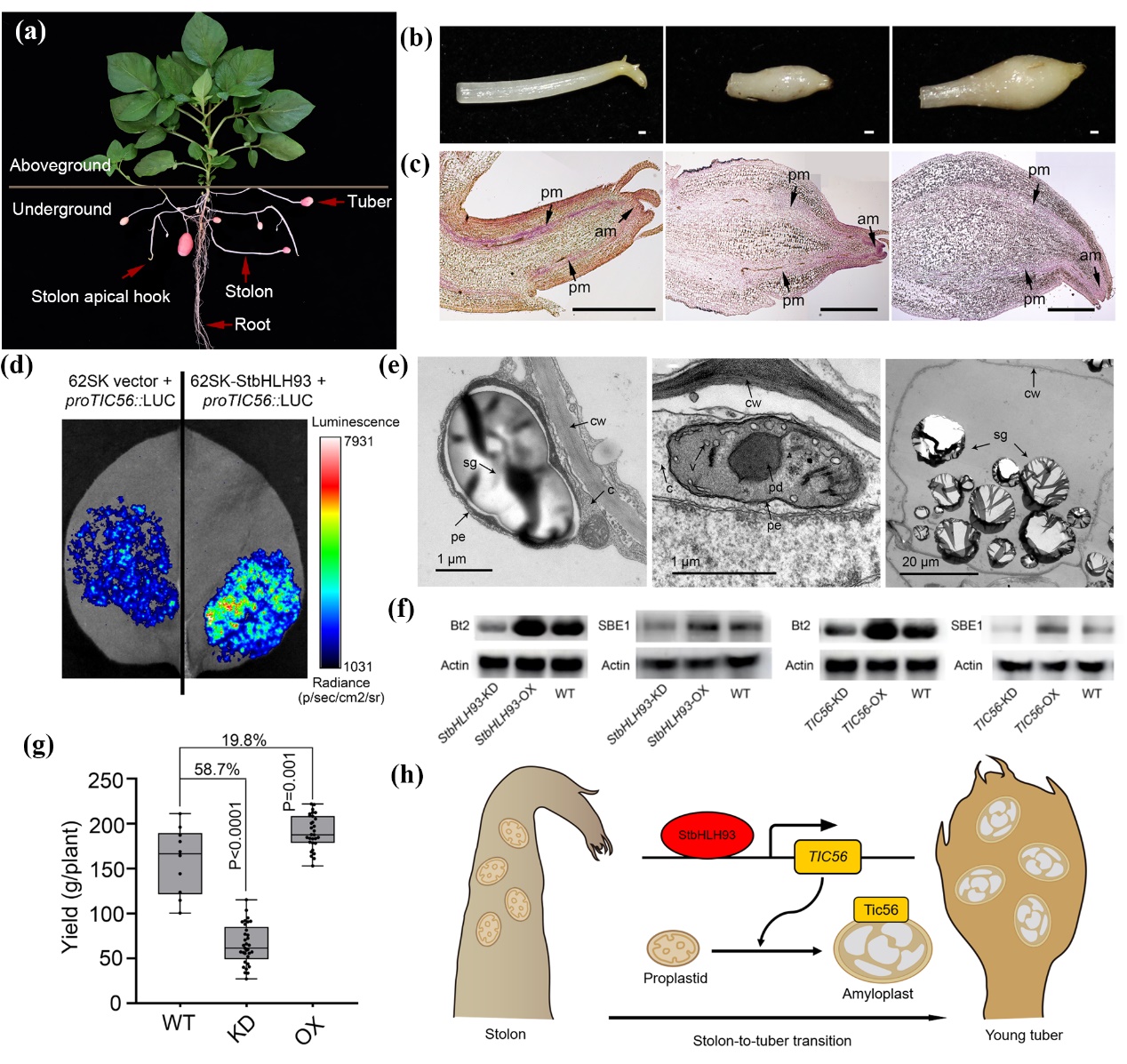 (a)马铃薯模式图; (b)匍匐茎膨大过程示意图; (c)StbHLH93原位杂交,结果表明StbHLH93主要在马铃薯块茎和匍匐茎亚顶端的髓周区和顶端分生区高表达; (d)双荧光素酶报告基因检测,结果表明StbHLH93能直接结合TIC56基因的启动子,激活其表达; (e)透射电子显微镜分析,结果发现下调TIC56基因表达,导致原质体向造粉体的分化受阻; (f)蛋白质印迹检测,结果发现下调StbHLH93或TIC56 的表达降低了淀粉合成关键蛋白的丰度; (g)马铃薯单株产量统计; (h)StbHLH93的作用模型。