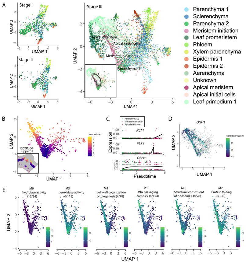进一步解析地下茎生长发育的细胞生物学过程,发现生长发育阶段I和II中分生组织起始群与薄壁组织2群重叠,而在第Ⅲ阶段,两群出现分离,并与顶端分生组织群、叶原基1群、顶端起始细胞群和薄壁组织2群形成发育闭环(图4)。第III发育阶段包含顶端分生组织细胞群的RNA剪切速率显示出从地下茎顶端到内圈维管束的发育方向,表明在第III阶段地下茎顶端分生组织开始分化为其他类型的细胞群。这些结果表明从顶端分生组织群到顶端起始细胞群的发育顺序,起始细胞群随后分化成薄壁细胞并形成一个完整的发育轨迹。将拟时序结果映射到地下茎对应细胞群的空间位置上发现地下茎顶端附近的分生组织起始位点具有更晚的拟时序,与地下茎生长发育的生物学特性一致。这项研究为长雄野生稻地下茎生长发育的生物学机制解析提供了重要的理论支撑。