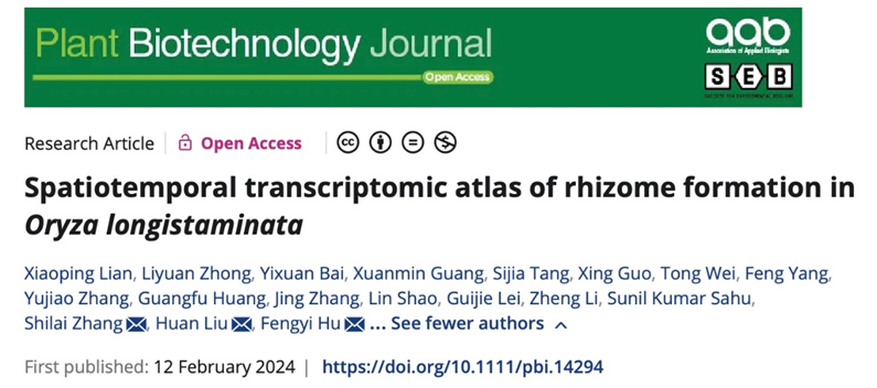 近日,williamhill英国官网胡凤益团队联合深圳华大生命科学研究院刘欢团队完成题为“Spatiotemporal transcriptomic atlas of rhizome formation in Oryza longistaminata”的研究论文在植物学知名期刊Plant Biotechnology Journal上发表。