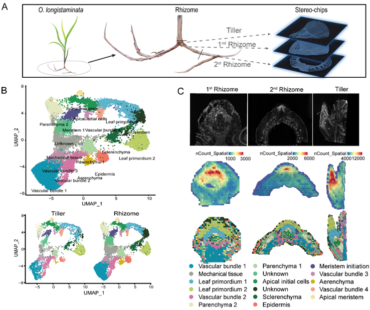 该团队利用长读长测序(PacBio HiFi)结合HiC组装了长雄野生稻双单倍型基因组,基因组大小为358 Mb,scaffold N50 为26.7 Mb。利用崭新的时空组学技术(Stereo-seq)构建了长雄野生稻地下茎一次分支、二次分支以及分蘖的空间转录组图谱(图1),共鉴定出17个细胞群,UMAP非线性降维可视化分析发现不同细胞群之间的界限明显,同时地下茎细胞群能与分蘖细胞群聚合在一起,表明在组织结构上地下茎与分蘖细胞群存在一致性,推测地下茎的形成是由基因的特异性表达引起。另外,地下茎和分蘖各细胞群的空间细胞群图谱与解剖学组织结构一致。