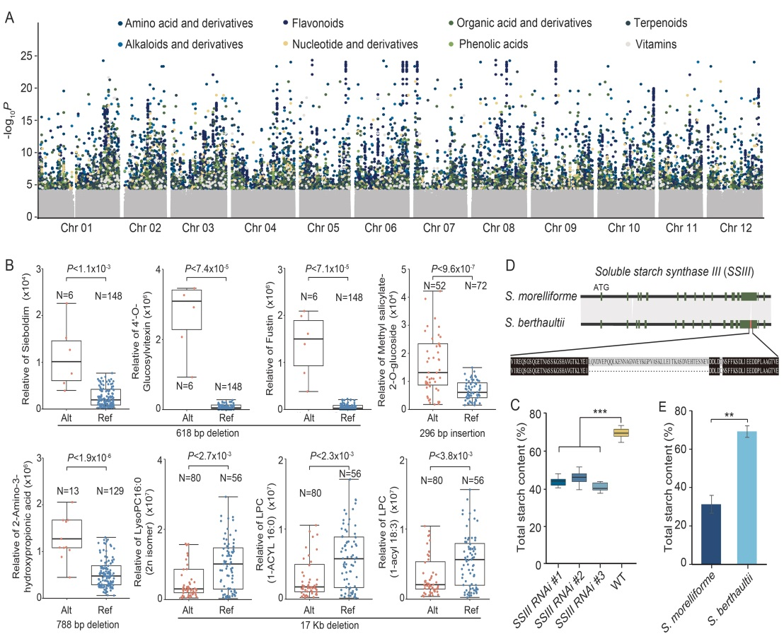 近日,williamhill英国官网黄斌全研究员课题组在植物科学领域TOP期刊Molecular Plant(5年平均影响因子为21.4)在线发表了题为“Graph-based pangenome provides insights into the structural variation and genetic basis of metabolic traits in potato”的研究论文,该研究构建了覆盖整个马铃薯组的泛基因组/图基因组,利用全基因组的结构变异,对马铃薯块茎代谢物进行了全基因组关联分析,发现了系列马铃薯块茎重要代谢物的关键遗传位点。该研究为解析马铃薯品质性状遗传分子机制奠定了重要基础,为进一步的马铃薯品质性状遗传改良提供了理论基础。
