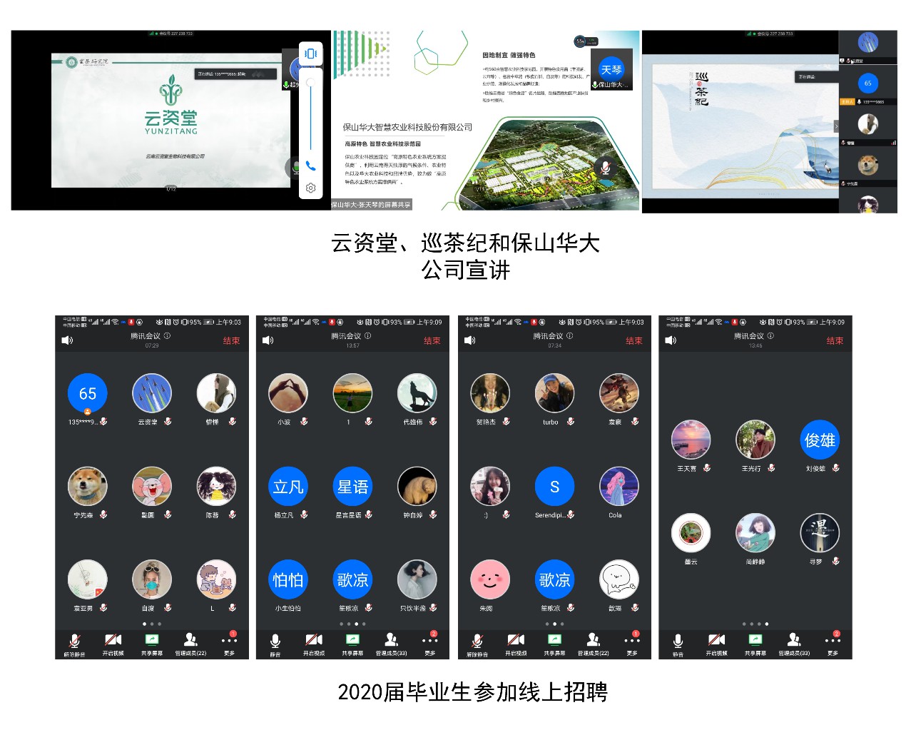 2020年6月19日,williamhill英国官网邀请到了云南云资堂生物科技有限公司(简称云资堂)、云南巡茶纪文化传播有限公司(简称巡茶纪)、保山华大智慧农业科技股份有限公司(保山华大)三家公司进行线上宣讲及招聘(腾讯会议),为毕业生搭建了良好的就业机会和平台。