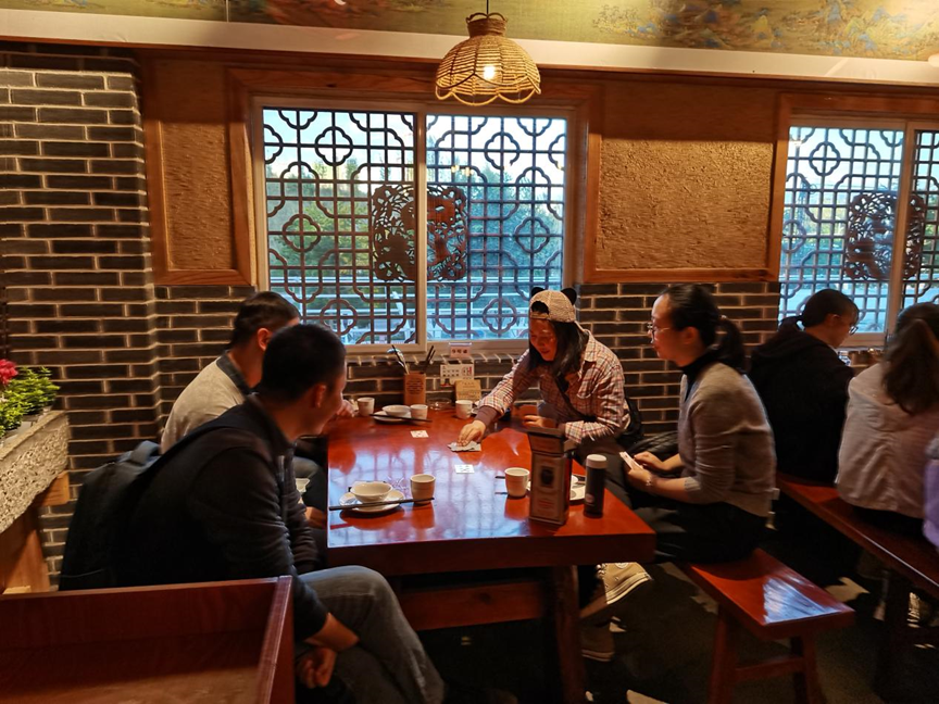 爬山活动结束后,大家来到茶室休息,部分教职工接着又玩起了扑克牌(图5)。看来爬山活动并未给大家带来疲倦,老师们仍然欢快地沉浸在活动中。